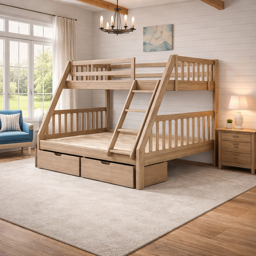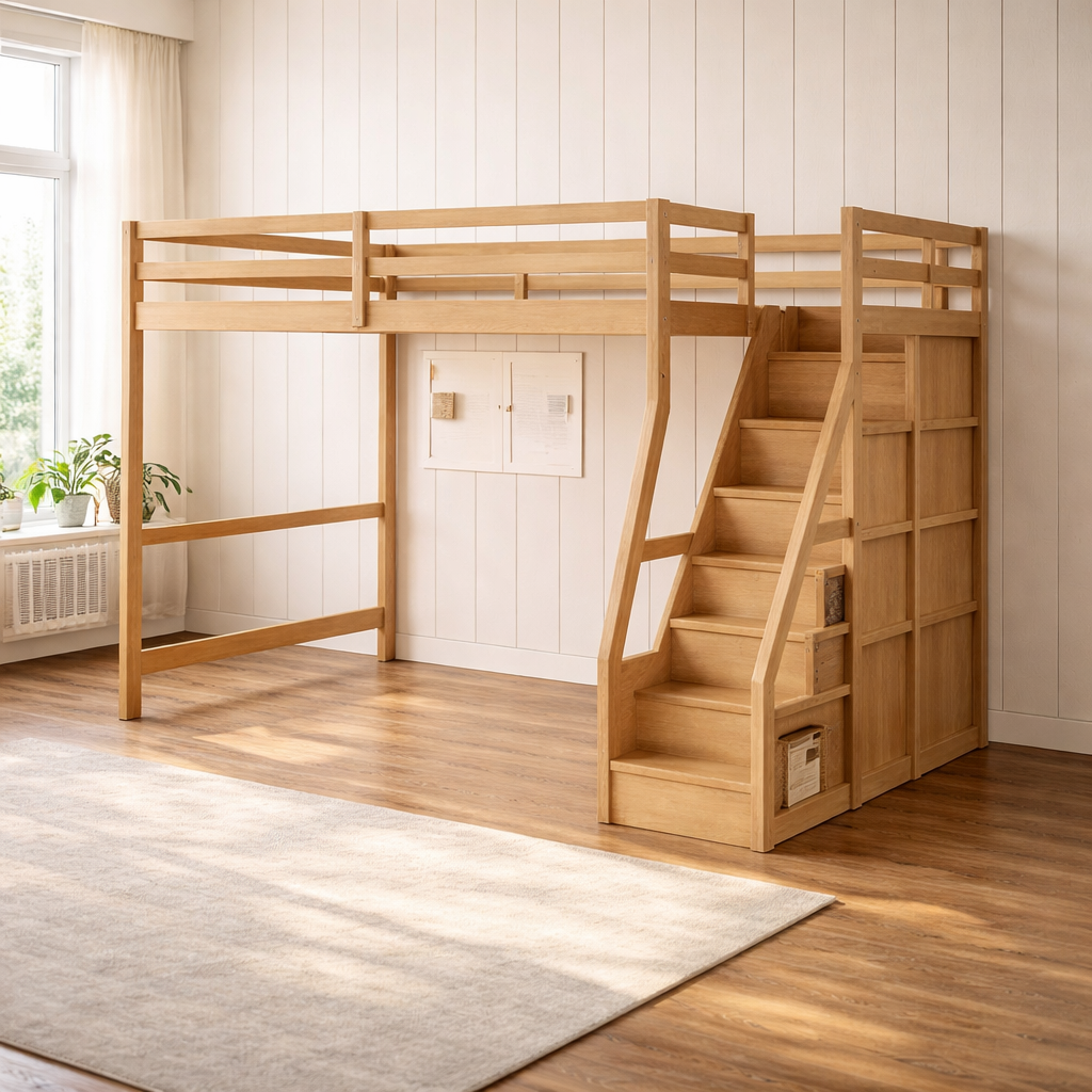 Hochbett mit erhöhter Liegefläche und stabiler Rahmenkonstruktion. Der Raum unter dem Bett kann flexibel genutzt werden, beispielsweise für einen Schreibtisch, Stauraum oder andere Möbel. Geeignet für Kinder-, Jugend- oder kompakte Wohnräume, unterstützt eine effiziente Nutzung der vorhandenen Fläche im Alltag.