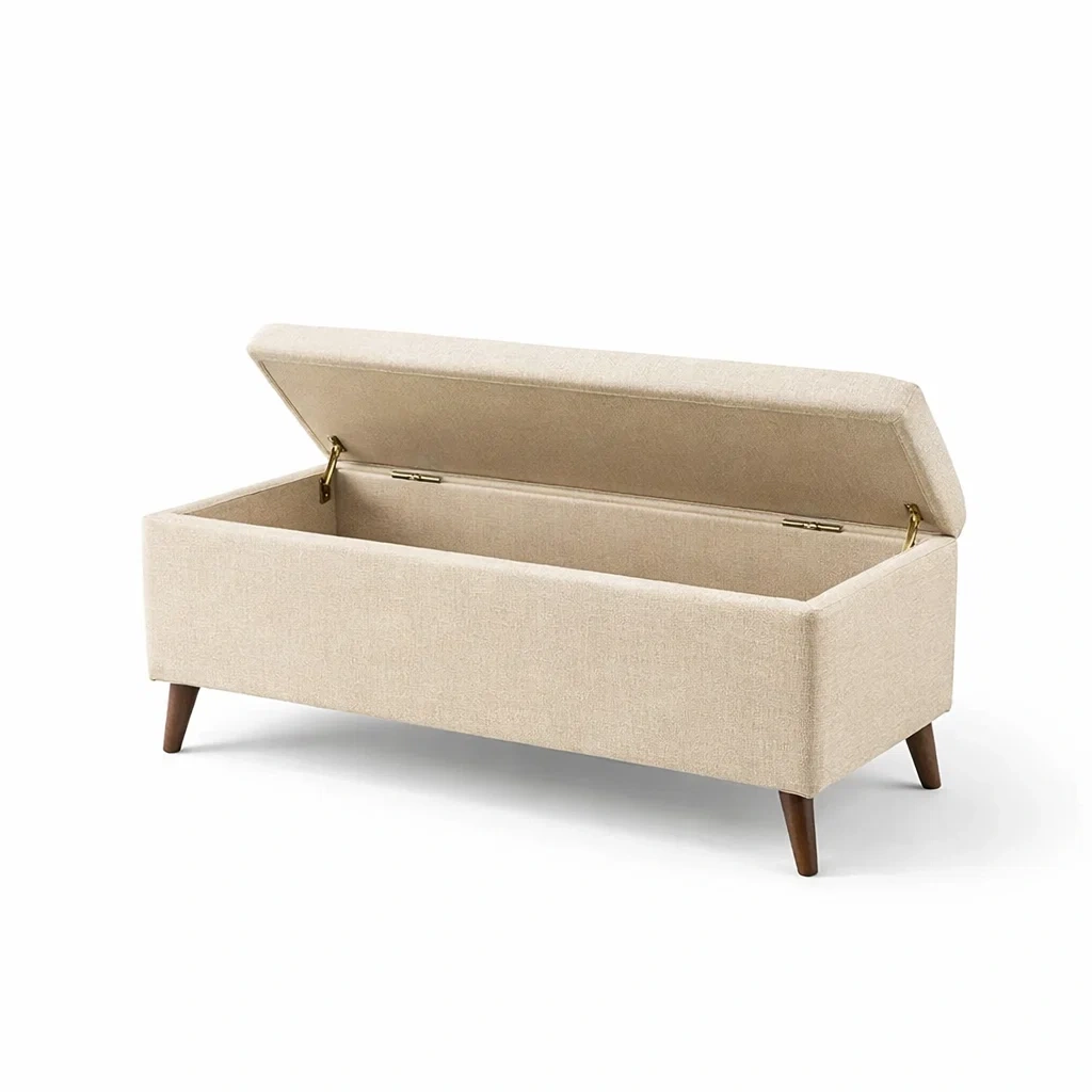 Die Sitzbank besteht aus einem Leinenstoff als Außenmaterial und einem Baumwollfutter innen. Die Beine sind aus Massivholz gefertigt.